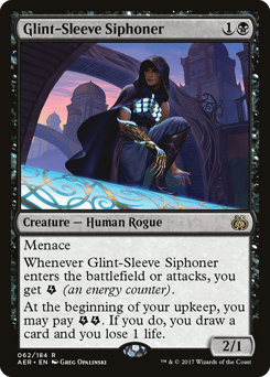 Menace Whenever this creature enters or attacks, you get {E} (an energy counter). At the beginning of your upkeep, you may pay {E}{E}. If you do, you draw a card and you lose 1 life.