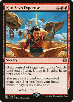 First strike, menace Whenever Kari Zev attacks, create Ragavan, a legendary 2/1 red Monkey creature token. Ragavan enters tapped and attacking. Exile that token at end of combat.
