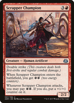 Double strike (This creature deals both first-strike and regular combat damage.) When this creature enters, you get {E}{E} (two energy counters). Whenever this creature attacks, you may pay {E}{E}. If you do, put a +1/+1 counter on it.
