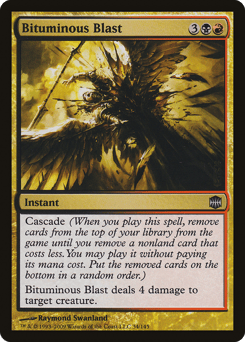 Cascade (When you cast this spell, exile cards from the top of your library until you exile a nonland card that costs less. You may cast it without paying its mana cost. Put the exiled cards on the bottom in a random order.) Bituminous Blast deals 4 damage to target creature.