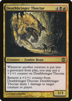 Whenever another creature dies, you may put a +1/+1 counter on this creature. Remove a +1/+1 counter from this creature: It deals 1 damage to any target.