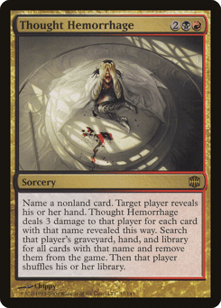 Choose a nonland card name. Target player reveals their hand. Thought Hemorrhage deals 3 damage to that player for each card with the chosen name revealed this way. Search that player's graveyard, hand, and library for all cards with that name and exile them. Then that player shuffles.