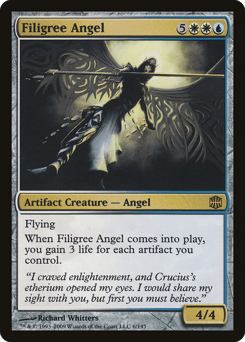 Flying When this creature enters, you gain 3 life for each artifact you control.