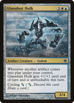 Whenever another artifact you control enters, this creature gets +1/+1 until end of turn and can't be blocked this turn. Cycling {W/U} ({W/U}, Discard this card: Draw a card.)