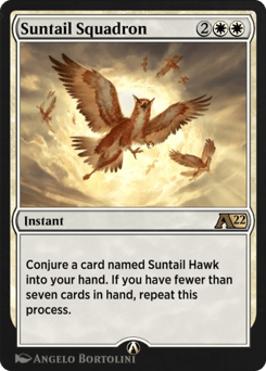 Conjure a card named Suntail Hawk into your hand. If you have fewer than seven cards in hand, repeat this process.