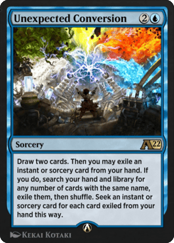 Draw two cards. Then you may exile an instant or sorcery card from your hand. If you do, search your hand and library for any number of cards with the same name, exile them, then shuffle. Seek an instant or sorcery card for each card exiled from your hand this way.