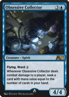 Flying, ward {2} Whenever Obsessive Collector deals combat damage to a player, seek a card with mana value equal to the number of cards in your hand.