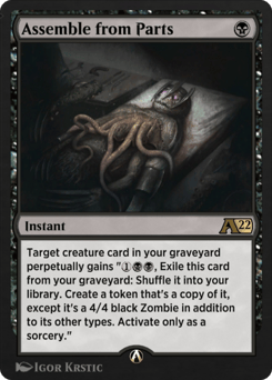 Target creature card in your graveyard perpetually gains "{1}{B}{B}, Exile this card from your graveyard: Shuffle it into its owner's library. Create a token that's a copy of it, except it's a 4/4 black Zombie in addition to its other types. Activate only as a sorcery."
