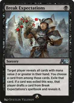 Target player reveals all cards with mana value 2 or greater in their hand. You choose a card from among those cards. Exile that card. If a card was exiled this way, that player drafts a card from Break Expectations's spellbook and reveals it.