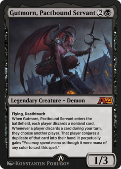 Flying, deathtouch When Gutmorn, Pactbound Servant enters the battlefield, each player discards a nonland card. Whenever a player discards a card during your turn, they choose another player. That player conjures a duplicate of that card into their hand. It perpetually gains "You may spend mana as though it were mana of any color to cast this spell."