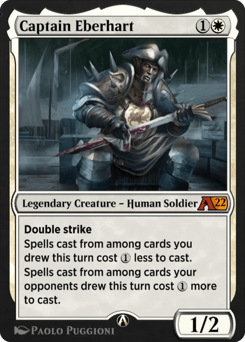 Double strike Spells cast from among cards you drew this turn cost {1} less to cast. Spells cast from among cards your opponents drew this turn cost {1} more to cast.