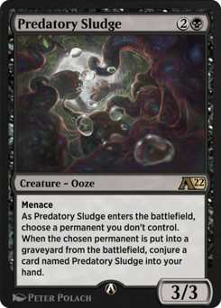 Menace As Predatory Sludge enters the battlefield, choose a permanent you don't control. When the chosen permanent is put into a graveyard from the battlefield, conjure a card named Predatory Sludge into your hand.