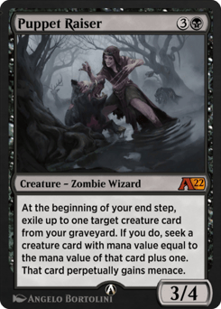 At the beginning of your end step, exile up to one target creature card from your graveyard. If you do, seek a creature card with mana value equal to the mana value of that card plus one. That card perpetually gains menace.