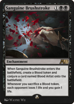 When Sanguine Brushstroke enters the battlefield, create a Blood token and conjure a card named Blood Artist onto the battlefield. Whenever you sacrifice a Blood token, each opponent loses 1 life and you gain 1 life.
