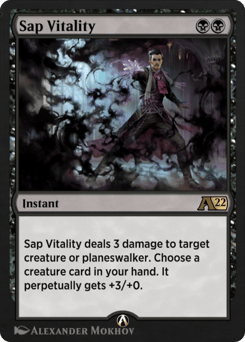 Sap Vitality deals 3 damage to target creature or planeswalker. Choose a creature card in your hand. It perpetually gets +3/+0.