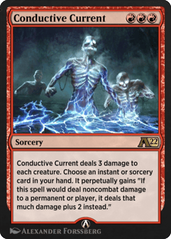 Conductive Current deals 3 damage to each creature. Choose an instant or sorcery card in your hand. It perpetually gains "If this spell would deal noncombat damage to a permanent or player, it deals that much damage plus 2 instead."