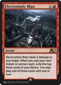 Electrostatic Blast deals 2 damage to any target. You get a one-time boon with "When you cast an instant or sorcery spell, exile the top three cards of your library. You may play one of those cards until end of turn."