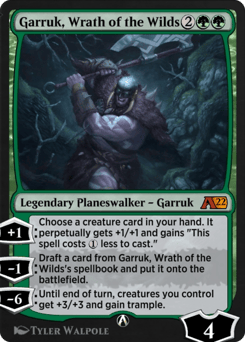 [+1]: Choose a creature card in your hand. It perpetually gets +1/+1 and perpetually gains "This spell costs {1} less to cast." [−1]: Draft a card from Garruk, Wrath of the Wilds's spellbook and put it onto the battlefield. [−6]: Until end of turn, creatures you control get +3/+3 and gain trample.