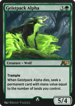 Trample When Geistpack Alpha dies, seek a permanent card with mana value equal to the number of lands you control.