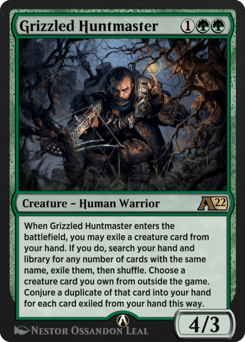 When Grizzled Huntmaster enters the battlefield, you may exile a creature card from your hand. If you do, search your hand and library for any number of cards with the same name, exile them, then shuffle. Choose a creature card you own from outside the game. Conjure a duplicate of that card into your hand for each card exiled from your hand this way.