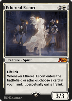 Lifelink Whenever this creature enters or attacks, choose a card in your hand. It perpetually gains lifelink.
