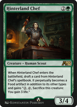 When Hinterland Chef enters the battlefield, draft a card from Hinterland Chef's spellbook. It perpetually becomes a Food artifact in addition to its other types and perpetually gains "{2}, {T}, Sacrifice this creature: You gain 3 life."