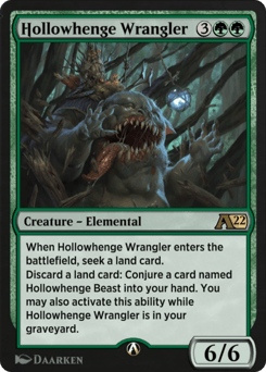 When Hollowhenge Wrangler enters the battlefield, seek a land card. Discard a land card: Conjure a card named Hollowhenge Beast into your hand. You may also activate this ability while Hollowhenge Wrangler is in your graveyard.