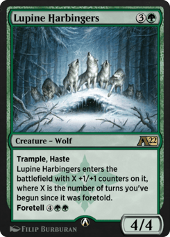 Trample, haste Lupine Harbingers enters the battlefield with X +1/+1 counters on it, where X is the number of turns you've begun since it was foretold. Foretell {4}{G}{G} (During your turn, you may pay {2} and exile this card from your hand face down. Cast it on a later turn for its foretell cost.)