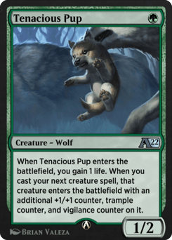 When Tenacious Pup enters the battlefield, you gain 1 life. When you cast your next creature spell, that creature enters the battlefield with an additional +1/+1 counter, trample counter, and vigilance counter on it.