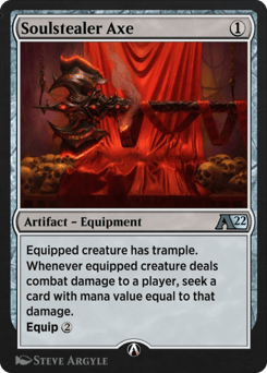Equipped creature has trample. Whenever equipped creature deals combat damage to a player, seek a card with mana value equal to that damage. Equip {2}