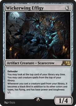 Defender You may look at the top card of your library any time. You may cast creature spells from the top of your library. Whenever you cast a creature spell from your library, it becomes a black Bird in addition to its other colors and types, has flying, and has base power and toughness 1/1.
