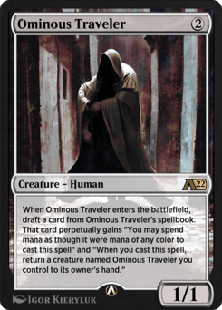 When Ominous Traveler enters the battlefield, draft a card from Ominous Traveler's spellbook. That card perpetually gains "You may spend mana as though it were mana of any color to cast this spell" and "When you cast this spell, return a creature named Ominous Traveler you control to its owner's hand."