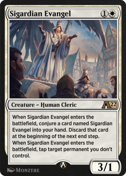 When Sigardian Evangel enters the battlefield, conjure a card named Sigardian Evangel into your hand. Discard that card at the beginning of the next end step. When Sigardian Evangel enters the battlefield, tap target permanent you don't control.