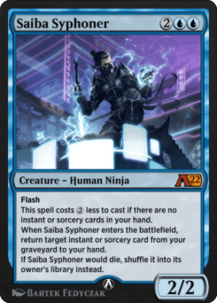 Flash This spell costs {2} less to cast if there are no instant or sorcery cards in your hand. When Saiba Syphoner enters the battlefield, return target instant or sorcery card from your graveyard to your hand. If Saiba Syphoner would die, shuffle it into your library instead.
