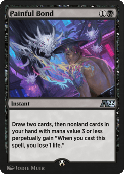 Draw two cards, then cards in your hand with mana value 3 or greater perpetually gain "When you cast this spell, you lose 1 life."