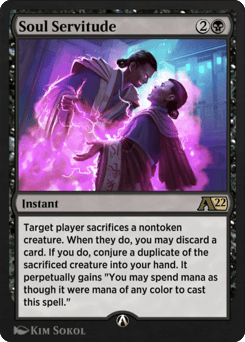 Target player sacrifices a nontoken creature. When they do, you may discard a card. If you do, conjure a duplicate of the sacrificed creature into your hand. It perpetually gains "You may spend mana as though it were mana of any color to cast this spell."