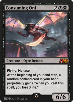 Flying, menace At the beginning of your end step, a random nonland card in your hand perpetually gains "When you cast this spell, you lose 3 life."