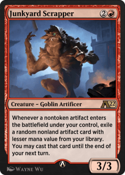Whenever a nontoken artifact enters the battlefield under your control, exile a random nonland artifact card with lesser mana value from your library. You may cast that card until the end of your next turn.