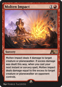 This sorcery deals 4 damage to target creature or planeswalker. If excess damage was dealt this way, note that excess damage, then you get a one-time boon with "When you cast an instant or sorcery spell, this boon deals damage equal to the noted number to target creature or planeswalker an opponent controls."