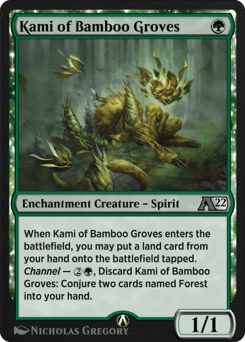 When Kami of Bamboo Groves enters the battlefield, you may put a land card from your hand onto the battlefield tapped. Channel — {2}{G}, Discard Kami of Bamboo Groves: Conjure two cards named Forest into your hand.