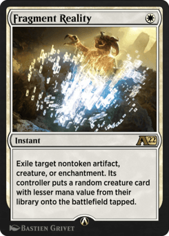 Exile target nontoken artifact, creature, or enchantment an opponent controls. Its controller puts a random creature card with lesser mana value from their library onto the battlefield tapped.