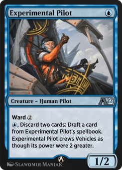 Ward {2} {U}, Discard two cards: Draft a card from Experimental Pilot's spellbook. Experimental Pilot crews Vehicles as though its power were 2 greater.