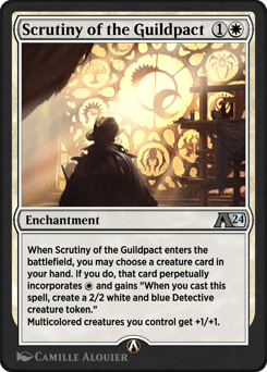 When Scrutiny of the Guildpact enters, you may choose a creature card in your hand. If you do, that card perpetually incorporates {W} and gains "When you cast this spell, create a 2/2 white and blue Detective creature token." Multicolored creatures you control get +1/+1.