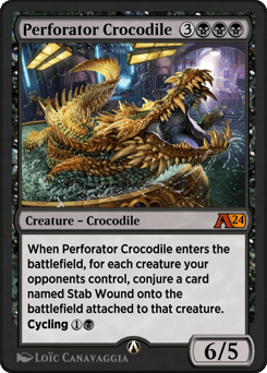 When Perforator Crocodile enters, for each creature your opponents control, conjure a card named Stab Wound onto the battlefield attached to that creature. Cycling {1}{B}