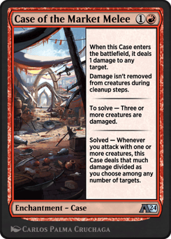 When this Case enters, it deals 1 damage to any target. Damage isn't removed from creatures during cleanup steps. To solve — Three or more creatures are damaged. Solved — Whenever you attack with one or more creatures, this Case deals that much damage divided as you choose among any number of targets.