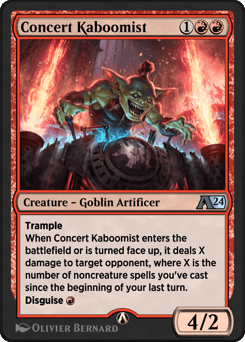 Trample When Concert Kaboomist enters or is turned face up, it deals X damage to target opponent, where X is the number of noncreature spells you've cast since the beginning of your last turn. Disguise {R}