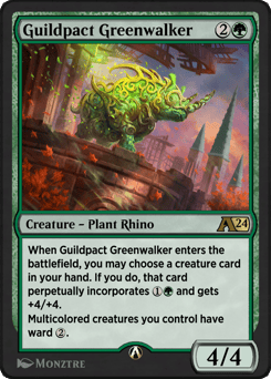 When Guildpact Greenwalker enters, you may choose a creature card in your hand. If you do, that card perpetually incorporates {1}{G} and gets +4/+4. Multicolored creatures you control have ward {2}.