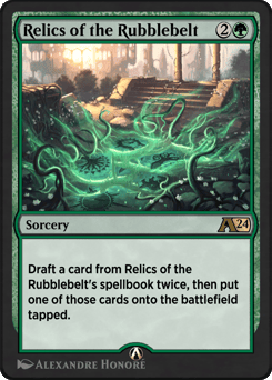 Draft a card from Relics of the Rubblebelt's spellbook twice, then put one of those cards onto the battlefield tapped.