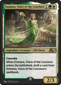 Convoke When Emmara, Voice of the Conclave enters, draft a card from Emmara, Voice of the Conclave's spellbook.