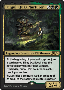 At the beginning of your end step, conjure a card named Slimy Dualleech onto the battlefield if you control no Leeches. Otherwise, put a +1/+1 counter on each Leech you control. {T}, Sacrifice a creature: Add an amount of {G} equal to the sacrificed creature's power.